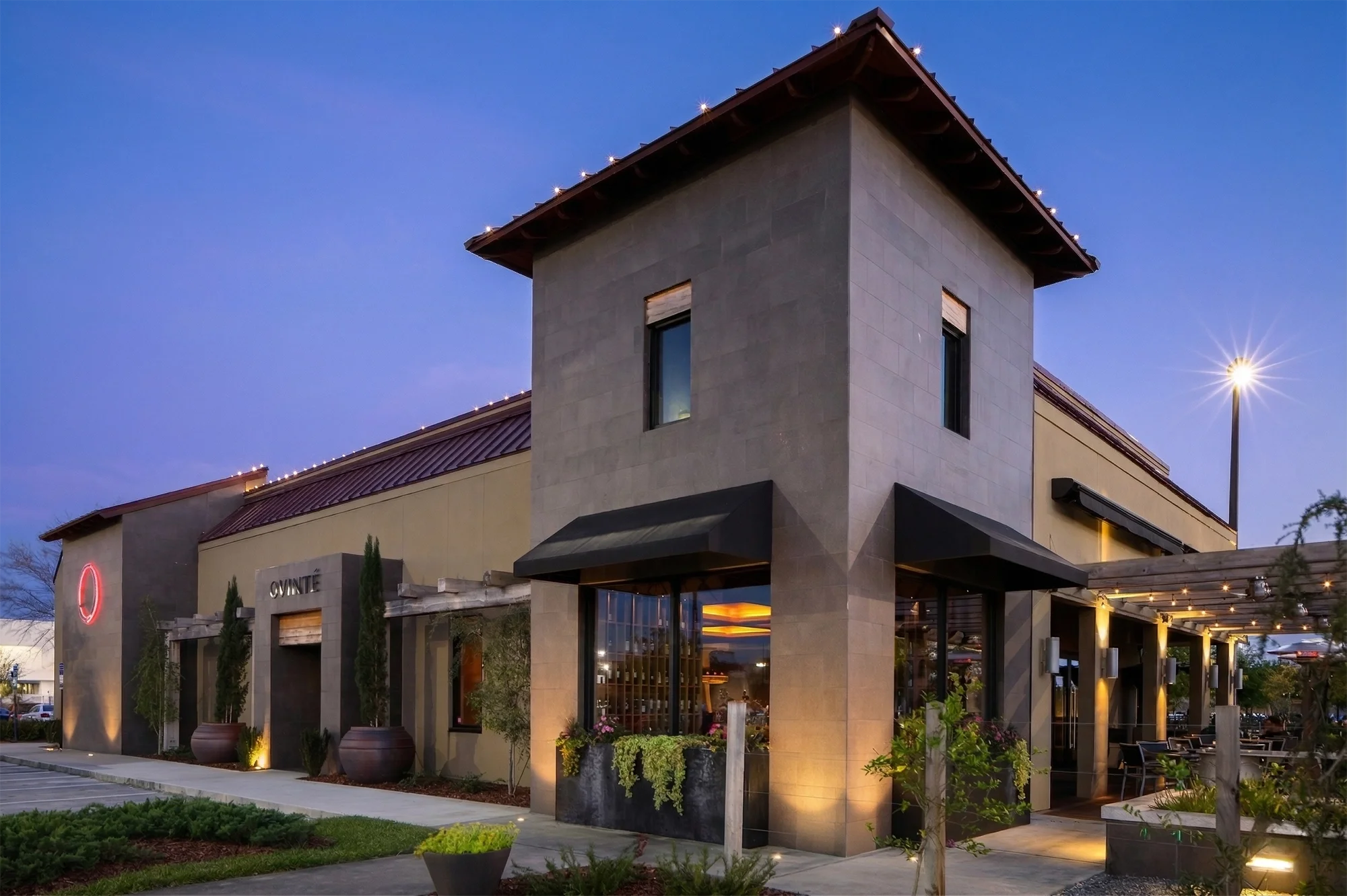 The directive was to create a warm, sexy environment to relax, drink, and eat. In addition to the large lounge seating area, the space contains dining, full kitchen, private wine lockers, retail with enomatic wine machines, and a tasting room for private or introductory wine tastings. The patio offers traditional and lounge seating, a large covered trellis, bocce court, and garden.